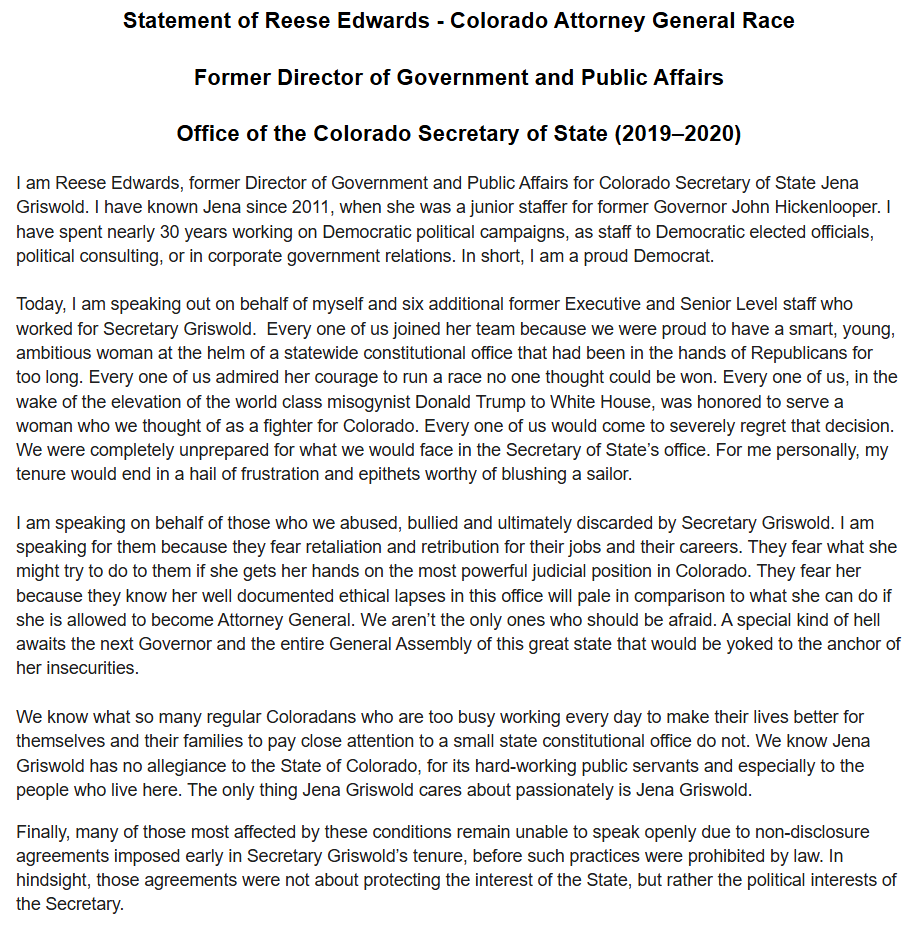 Reese Edwards, former Director of Gov & Public Affairs under Griswold, is speaking for 6 others who are too afraid to. Why afraid? Because they know what she does to people who cross her. 3/x