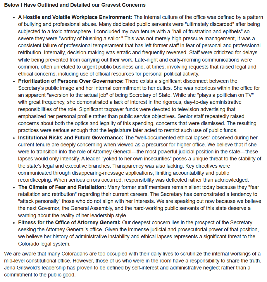 Colorado political insiders have known about Griswold's staff abuse for years. Most victims are locked behind NDAs. NDAs she imposed before the practice was banned by law. Let that sink in. 2/x