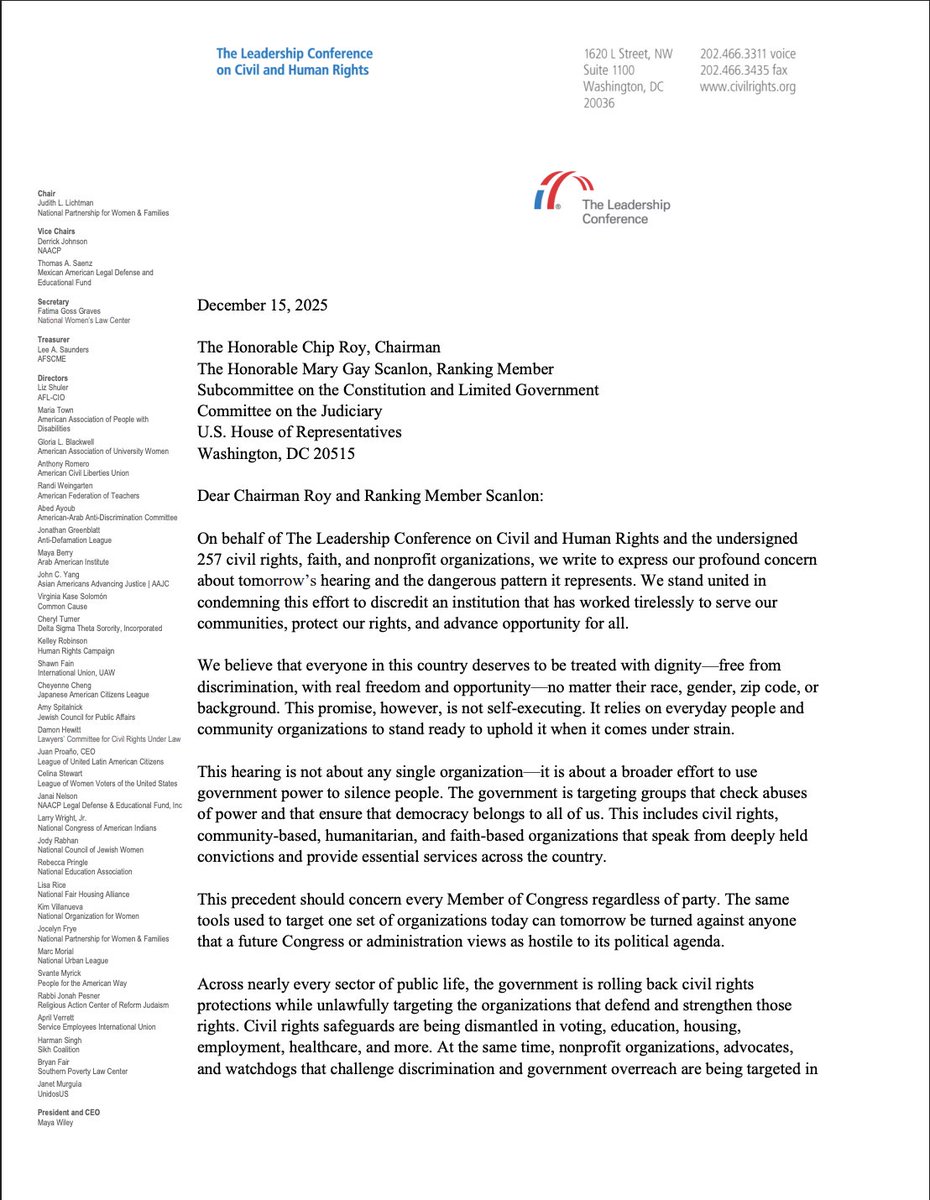 The letter claims that the hearing “is not about any single organization—it is about a broader effort to use government power to silence people.”
