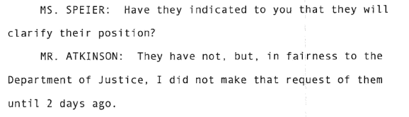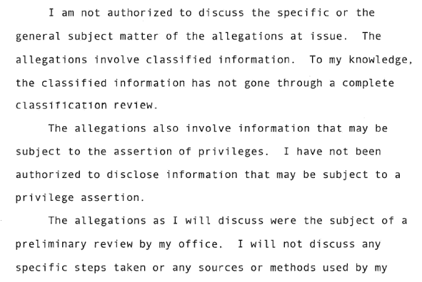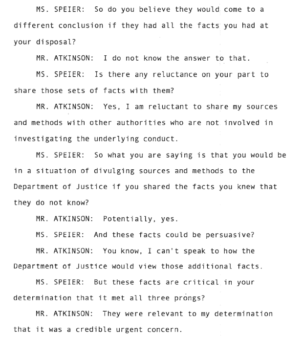 Michael Atkinson talks about the 14 day period, whether he would charge somebody with a crime (so you would think he'd appreciate DOJ getting involved but whatever) and then says he refuses to talk sources and methods.