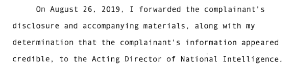 On August 26, 2019, Michael Atkinson forwarded the details to the Acting Director of National Intelligence (Joseph Maguire, who was appointed August 16, 2019).