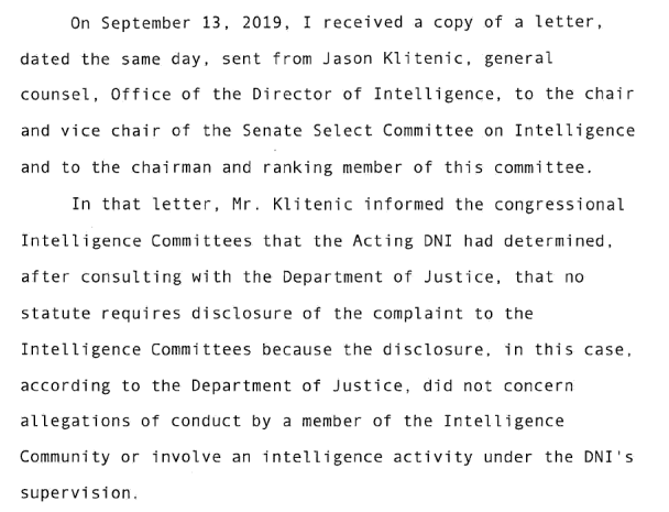 On September 13, 2019, Jason Klitenic (ODNI) sent a letter saying the complaint did not need to be disclosed after Maguire consulted with DOJ.