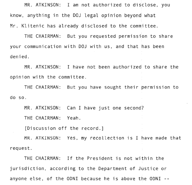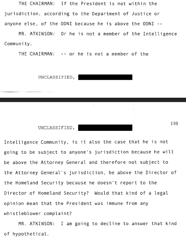 Michael Atkinson keeps refusing to answer questions relating to White House classification or potential privilege.
