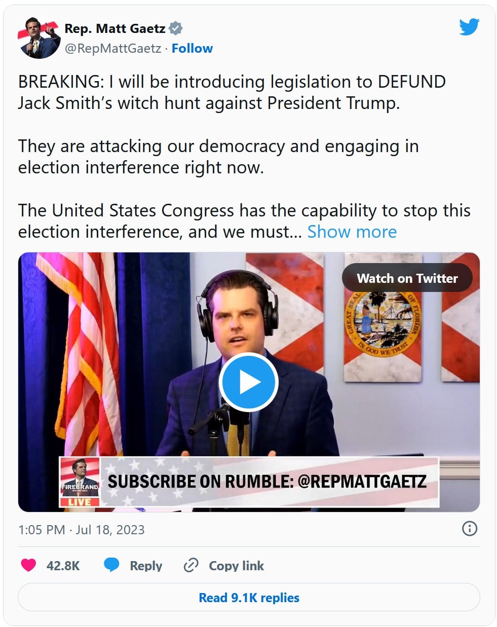 - Gaetz called for defunding Special Counsel Jack Smith, a biased Democrat investigating Donald Trump.