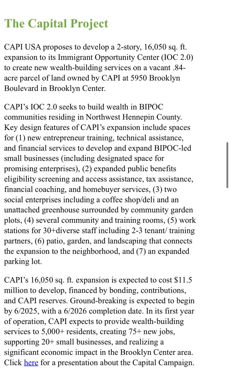 “CAPI’s IOC 2.0 seeks to build wealth in BIPOC communities residing in Northwest Hennepin County. Key design features of CAPI’s expansion include spaces for (1) new entrepreneur training, technical assistance, and financial services to develop and expand BIPOC-led small businesses (including designated space for promising enterprises), (2) expanded public benefits eligibility screening and access assistance, tax assistance, financial coaching, and homebuyer services, (3) two social enterprises including a coffee shop/deli and an unattached greenhouse surrounded by community garden plots, (4) several community and training rooms, (5) work stations for 30+diverse staff including 2-3 tenant/ training partners, (6) patio, garden, and landscaping that connects the expansion to the neighborhood, and (7) an expanded parking lot.”