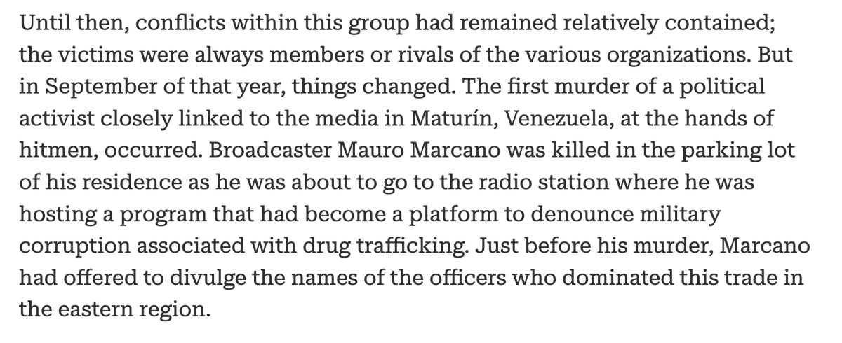 In 2004, journalist Mauro Marcano, who had been investigating high-ranking military figures linked to narcotics smuggling, was assassinated on the day he was preparing to reveal names of those involved. His murder became a national scandal and cemented the term โCartel de los Solesโ in the public consciousness.