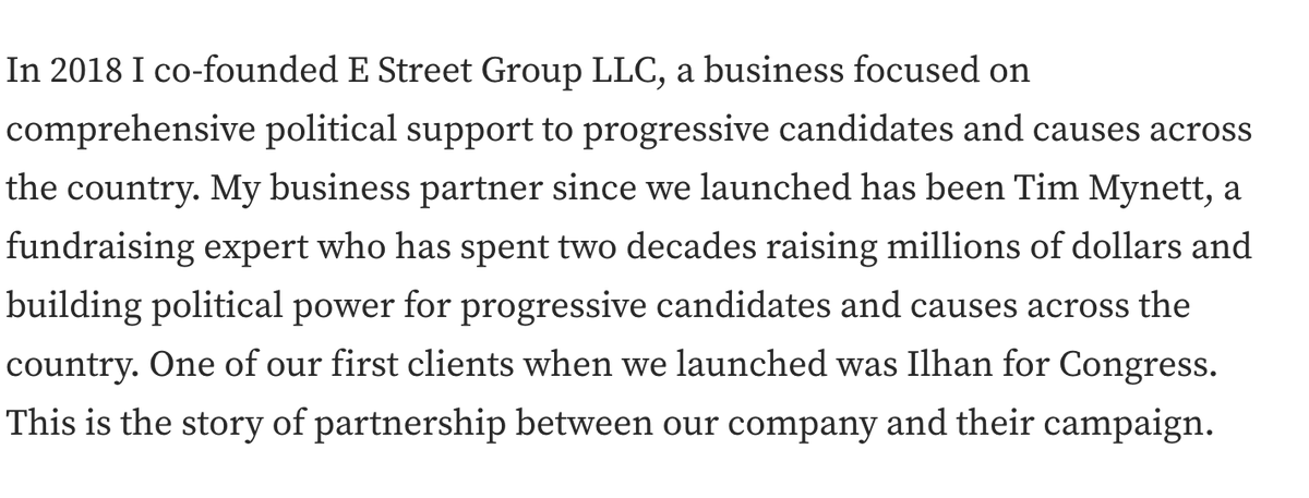 In 2018, Mynett co-founded E Street Group LLC with Will Hailer, the campaign manager for Keith Ellison. Among their first clients was Ilhan for Congress. They worked to elect her to Congress, even as her campaign paid them millions.