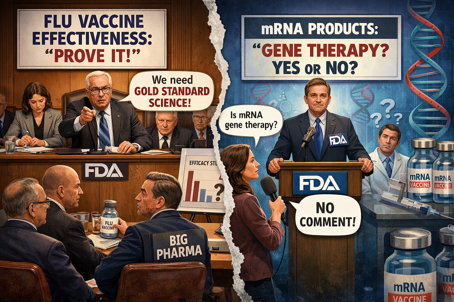 FDA Demands Big Pharma “Prove” Flu Vaccines Work—While Refusing to Answer If mRNA Products Are Gene Therapy. The Agency Calling for “Gold Standard Science” Can’t Answer a Yes-or-No Question About Its Own Definitions? Stop COVID vaccines Now! Nuremberg Hearing Project Activate!-Posted on interestofjustice.substack.com-By Interest of Justice-On January 18, 2026: