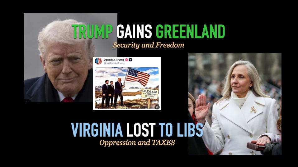 Trump Gains Greenland, VA Lost to Libs. Security and Freedom v. Oppression and TAXES!-Posted on loricolley.substack.com-By Lori Colley-On January 21, 2026: